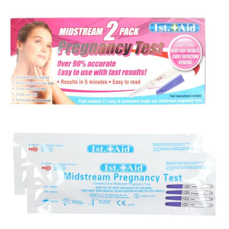 First Aid Pregnancy Test Kit, 2 pack. These test kits are easy to use and provide accurate results in just 5 minutes. The pack contains 2 individually wrapped test sticks that are intended for midstream use. They are easy to use, hygienic, give accurate early results and come with full instructions.