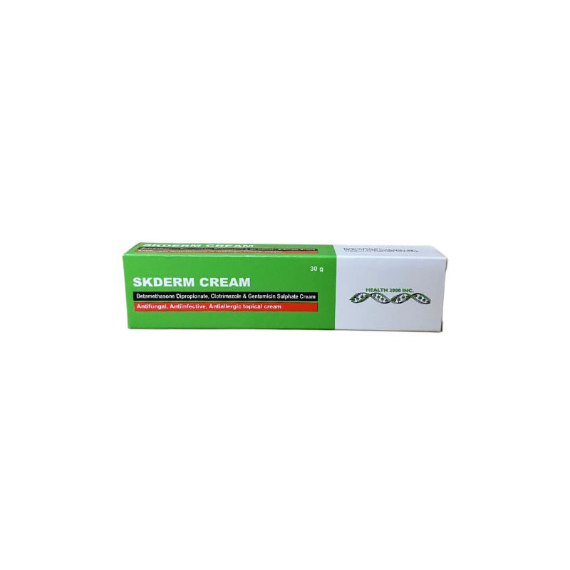 Skderm Cream is a triple action cream for the treatment of superficial skin lesions, infected eczema and other inflammatory dermatological conditions associated with bacterial and fungal infections. It contains betamethasone (corticosteroid), clotrimazole (antifungal) and gentamicin (antibiotic).